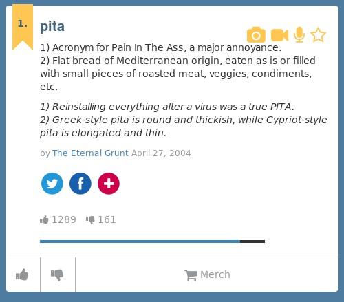 Urban Dictionary On Twitter Kelliem14 Pita 1 Acronym For Pain In The Ass A Major Annoyance 2 Flat Bread Http T Co Yo1lowomxb Http T Co Cfpifgjvgq