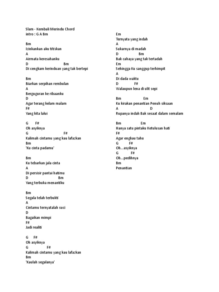 Chord aku merindu. Aku meminta pada yang ada. Bm D aku merindu F ku yakin kau tahu G tanpa batas waktu. Outro G C 2x D G.